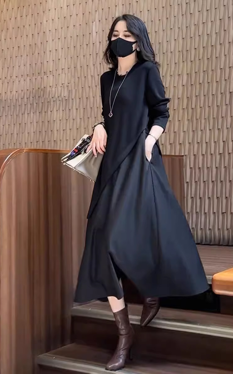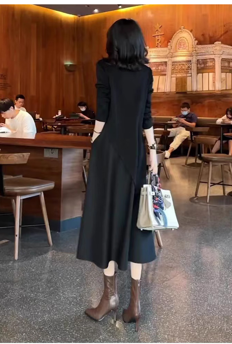 長袖 折り返す 無地 ジッパー付き ロング ニットワンピース