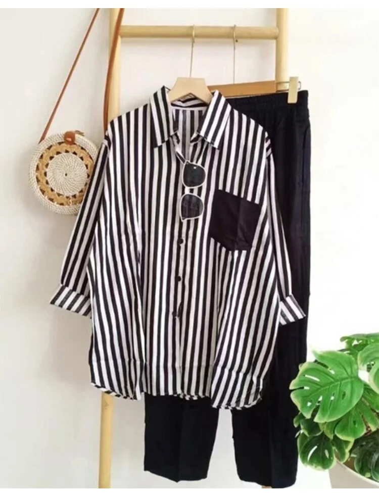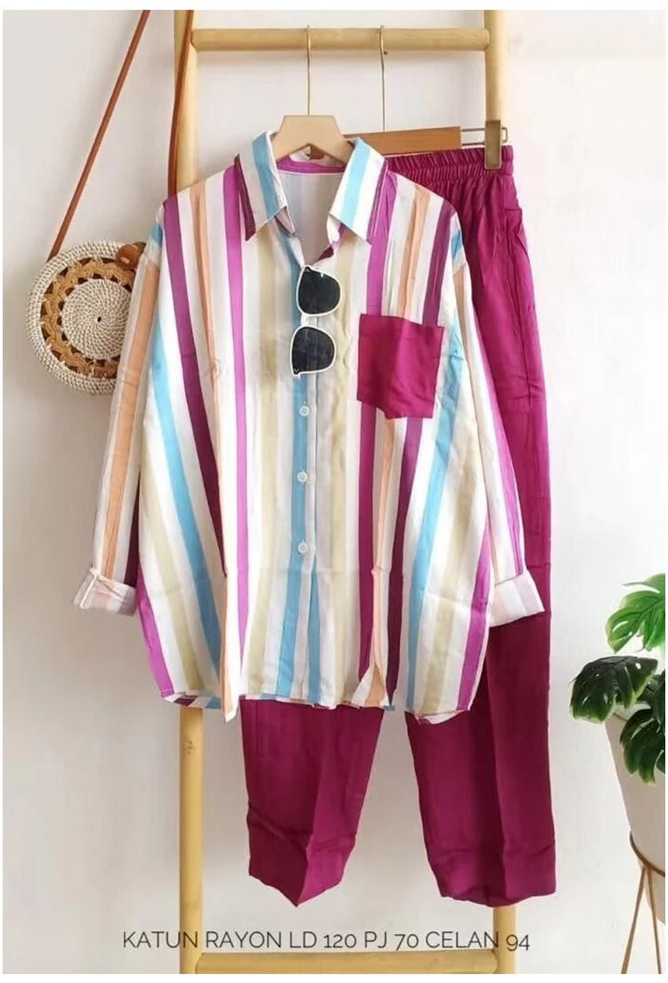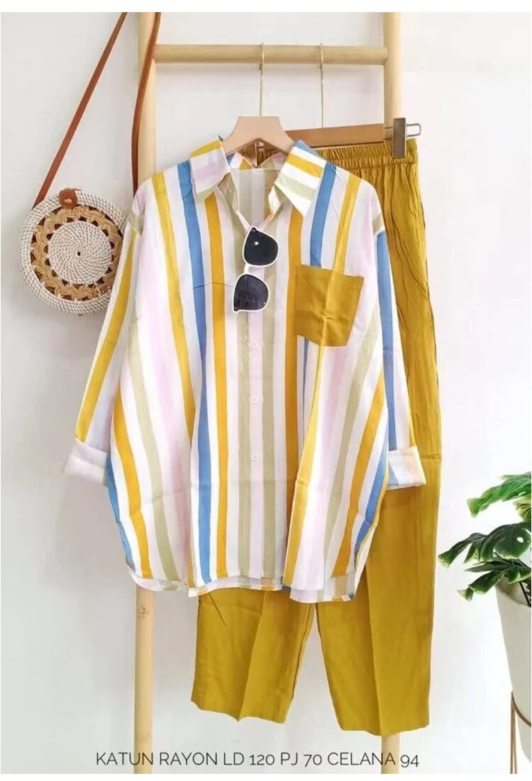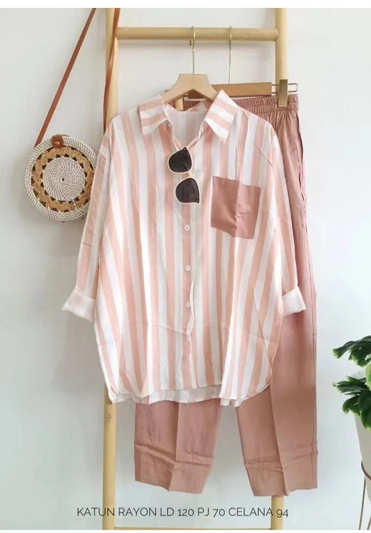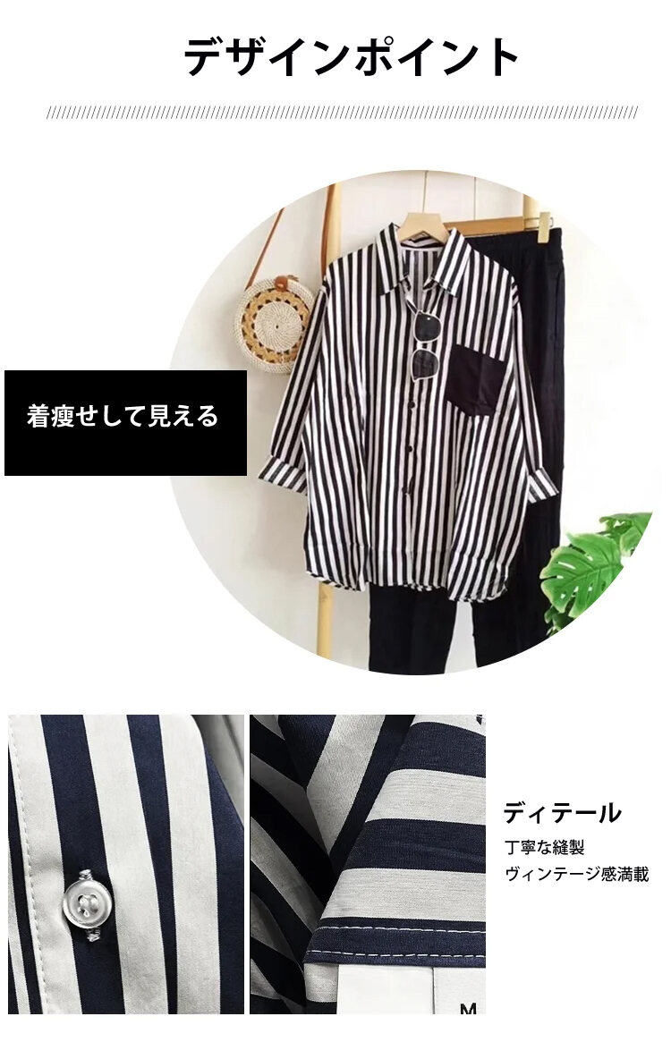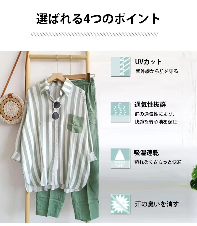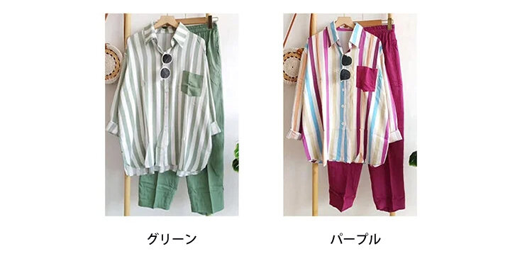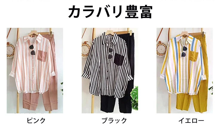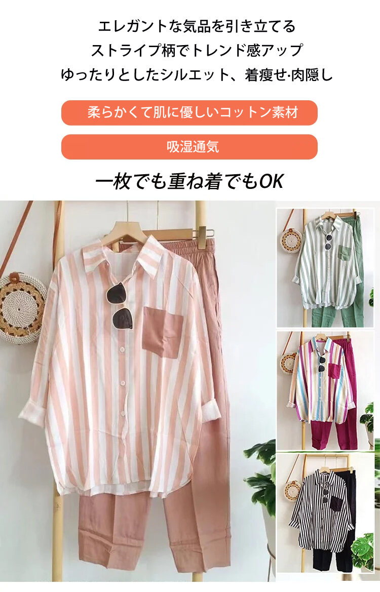 レディース カジュアル ストライプ柄 長袖 シャツ 上下セット