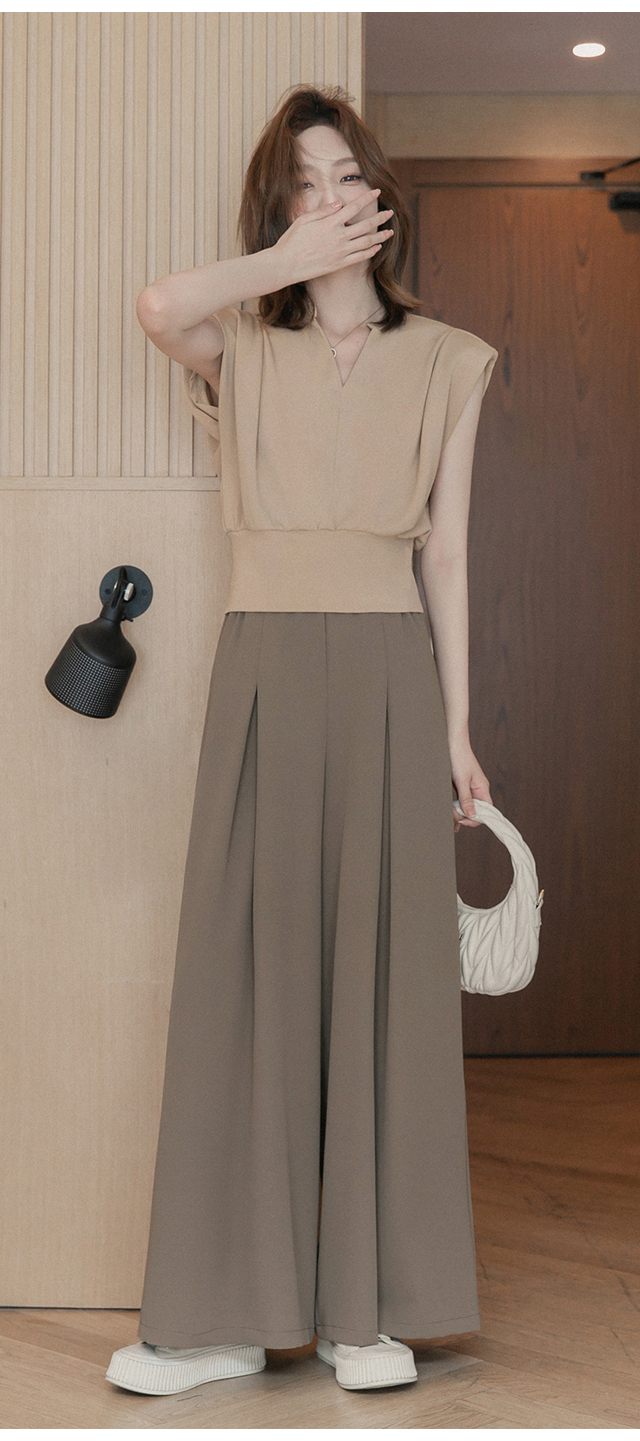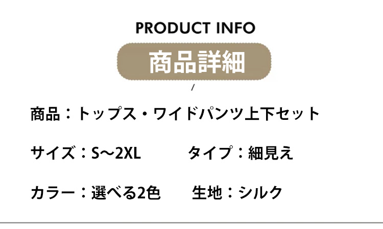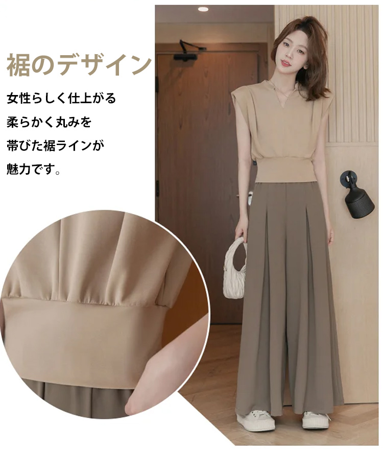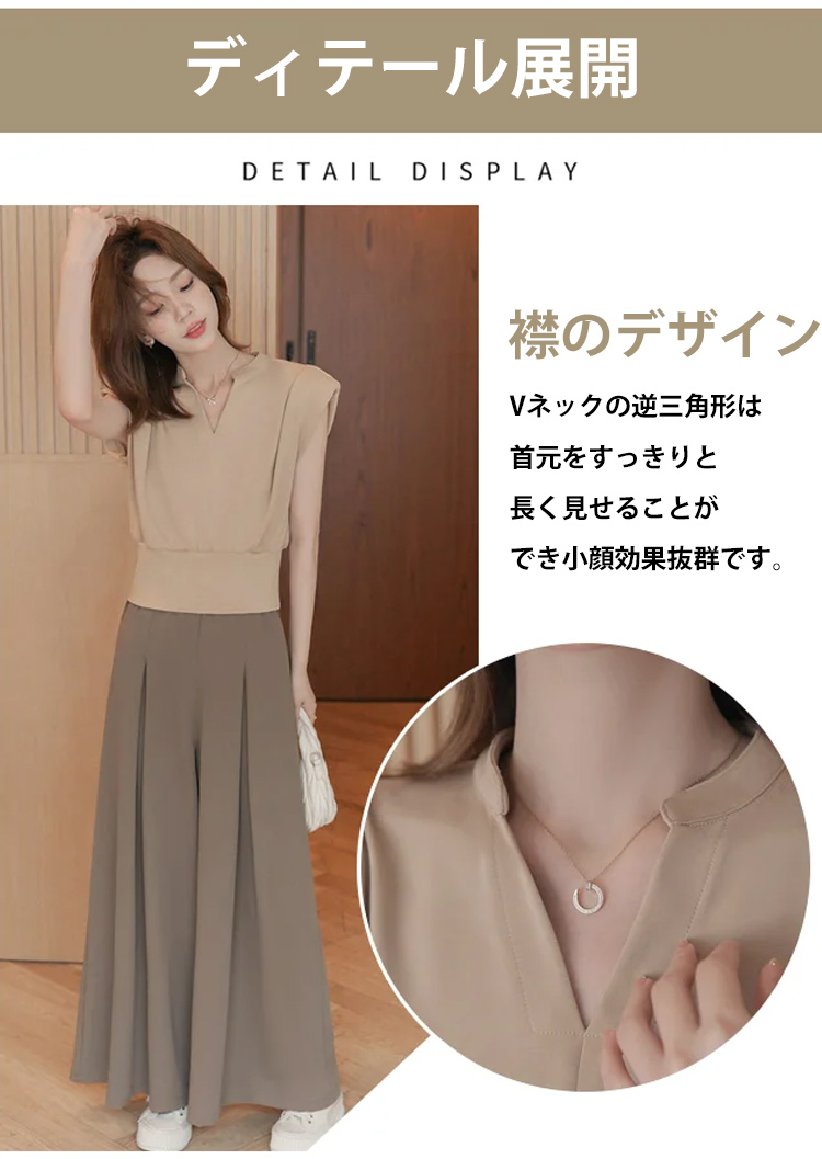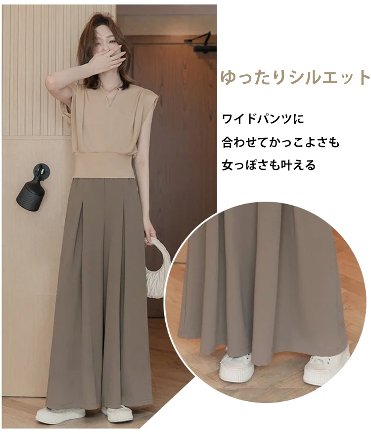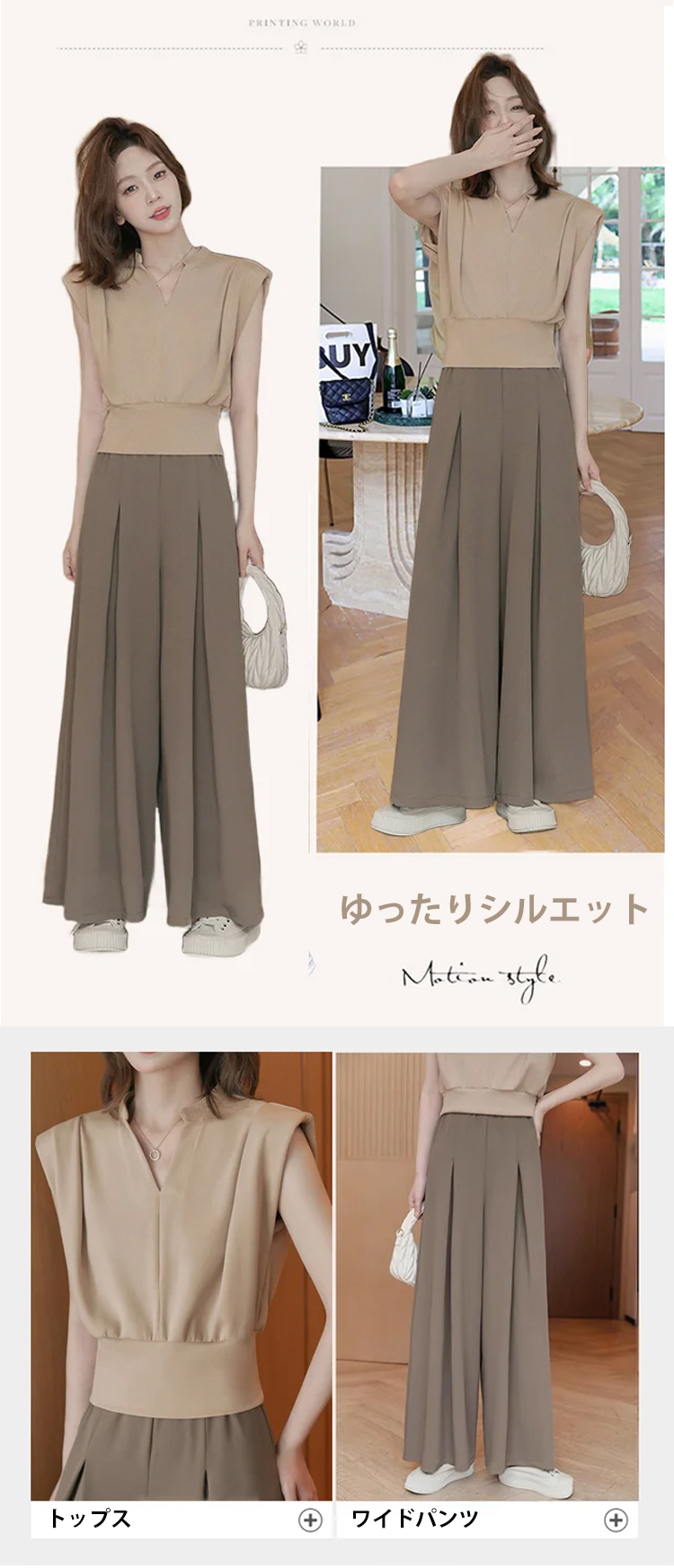 着痩せ Vネック カジュアル トップス+ワイドパンツ 上下セット