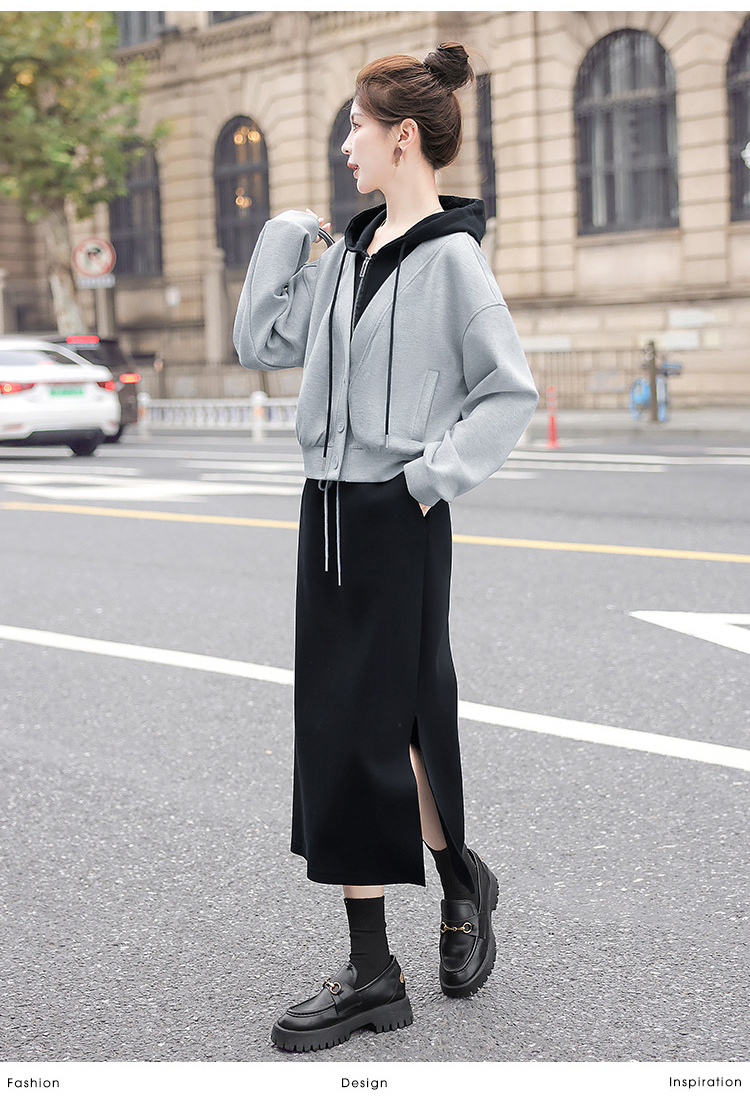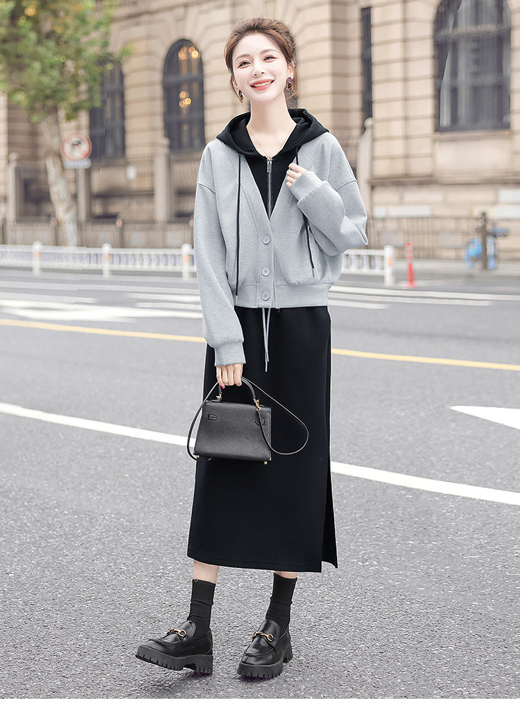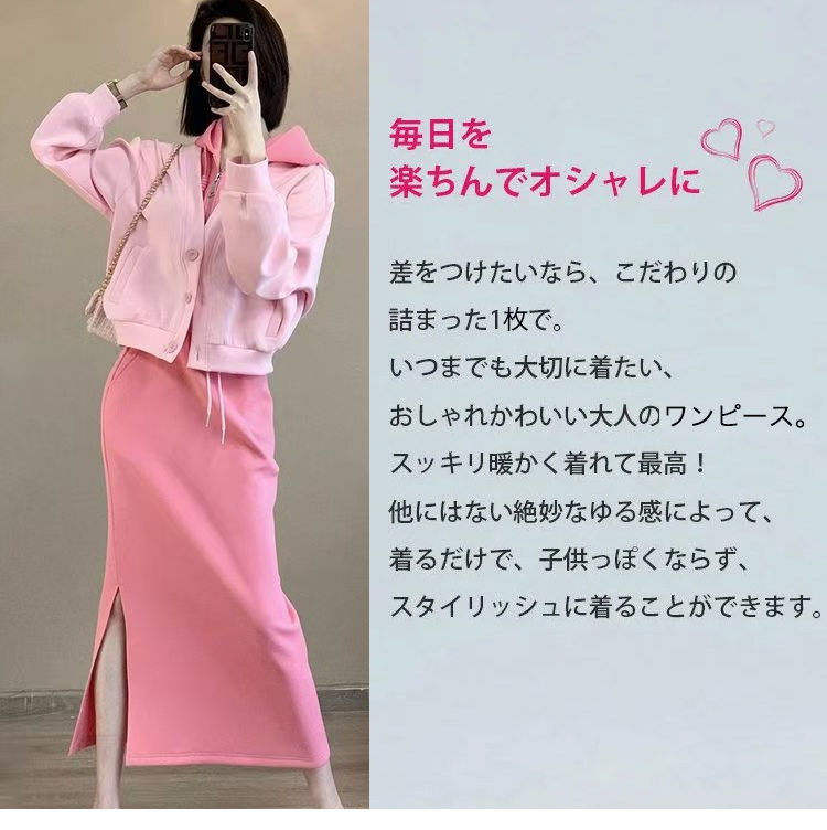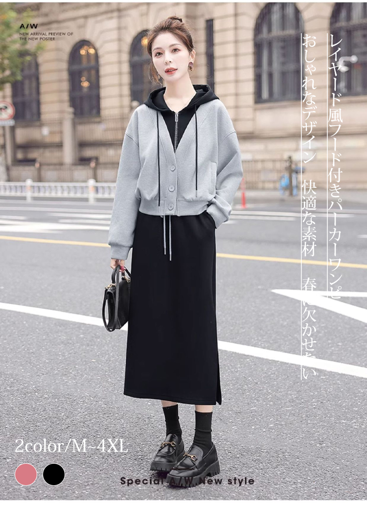 レイヤード風 フード付き パーカー+ワンピ 無地 セットアップ