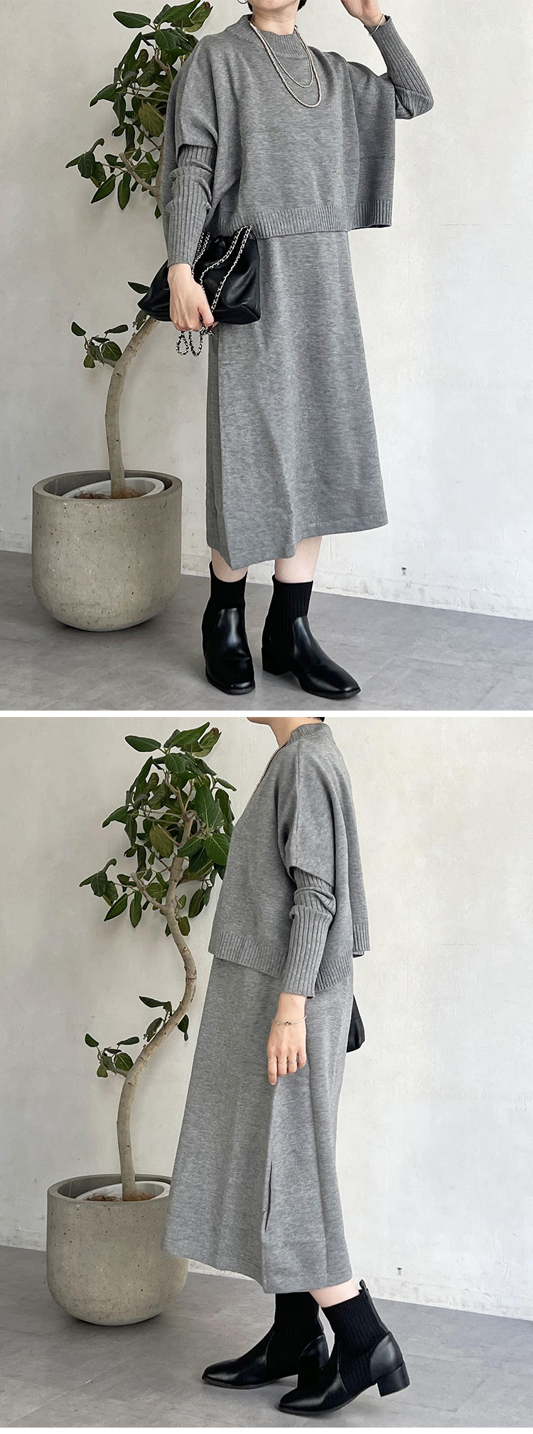 レイヤード風 無地 プルオーバー ドッキング ニットワンピース