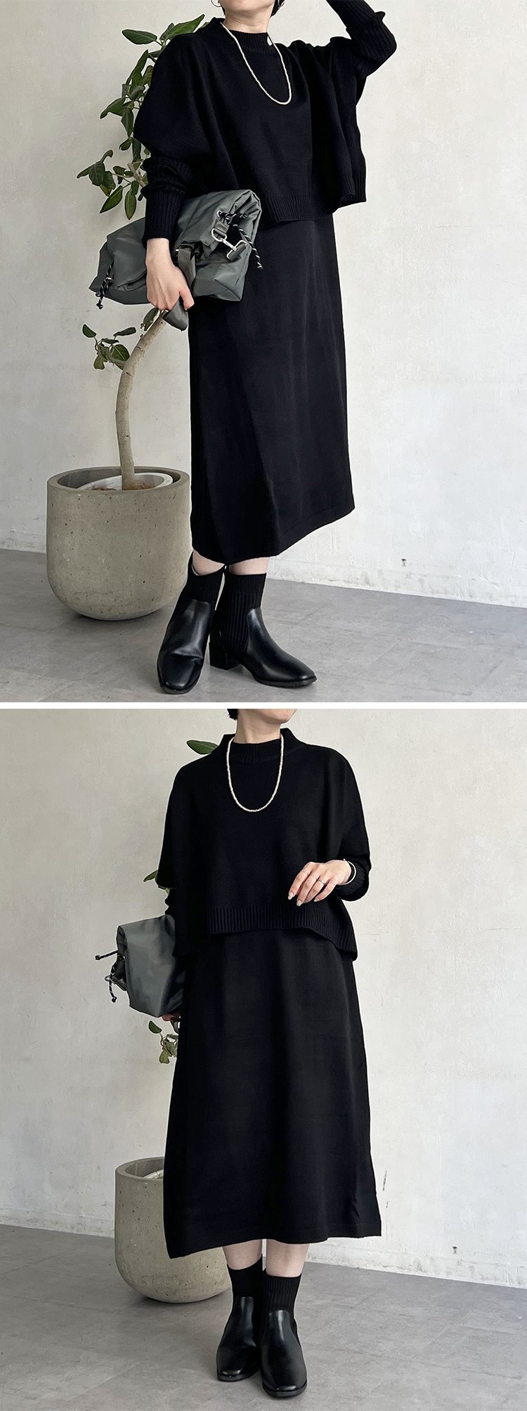 長袖 折り返す 無地 ジッパー付き ロング ニットワンピース